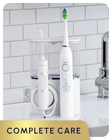 Take control of your oral care with the Waterpik Sensonic Complete Care water flosser + electric toothbrush. With advanced features and an intuitive design, this innovative oral care system provides exceptional results, in a compact device that uses just one outlet. Designed to help provide maximum plaque removal and optimal gum health, Waterpik Sensonic Complete Care is ideal for anyone looking for a custom flossing and brushing solution. The advanced Waterpik water flosser features 10 safe and effective pressure settings and a variety of specialty tips for specific dental needs, including maintaining implants, braces, and dental work. The rechargeable Sensonic electric toothbrush offers 3 brushing modes to personalize your experience: Clean, Stain Removal, and Gum Care. The Clean mode offers everyday cleaning performance, while the Stain Removal mode targets surface stains. The Gum Care mode gently enhances gum stimulation for a healthier smile. The advanced Sensonic brush head features ADA-compliant soft bristles that are contoured to hug the natural shape of your teeth, making it easier to clean hard-to-reach areas, even back teeth. Combined with advanced sonic technology, Waterpik Sensonic removes plaque bacteria with minimal effort. Waterpik brand products are tested and trusted. For more than 60 years, Waterpik has been designing and engineering clinically proven products that deliver superior oral care and is the #1 water flosser brand recommended by dental professionals. Backed by a 2-year manufacturer's limited warranty, see product manual for details.