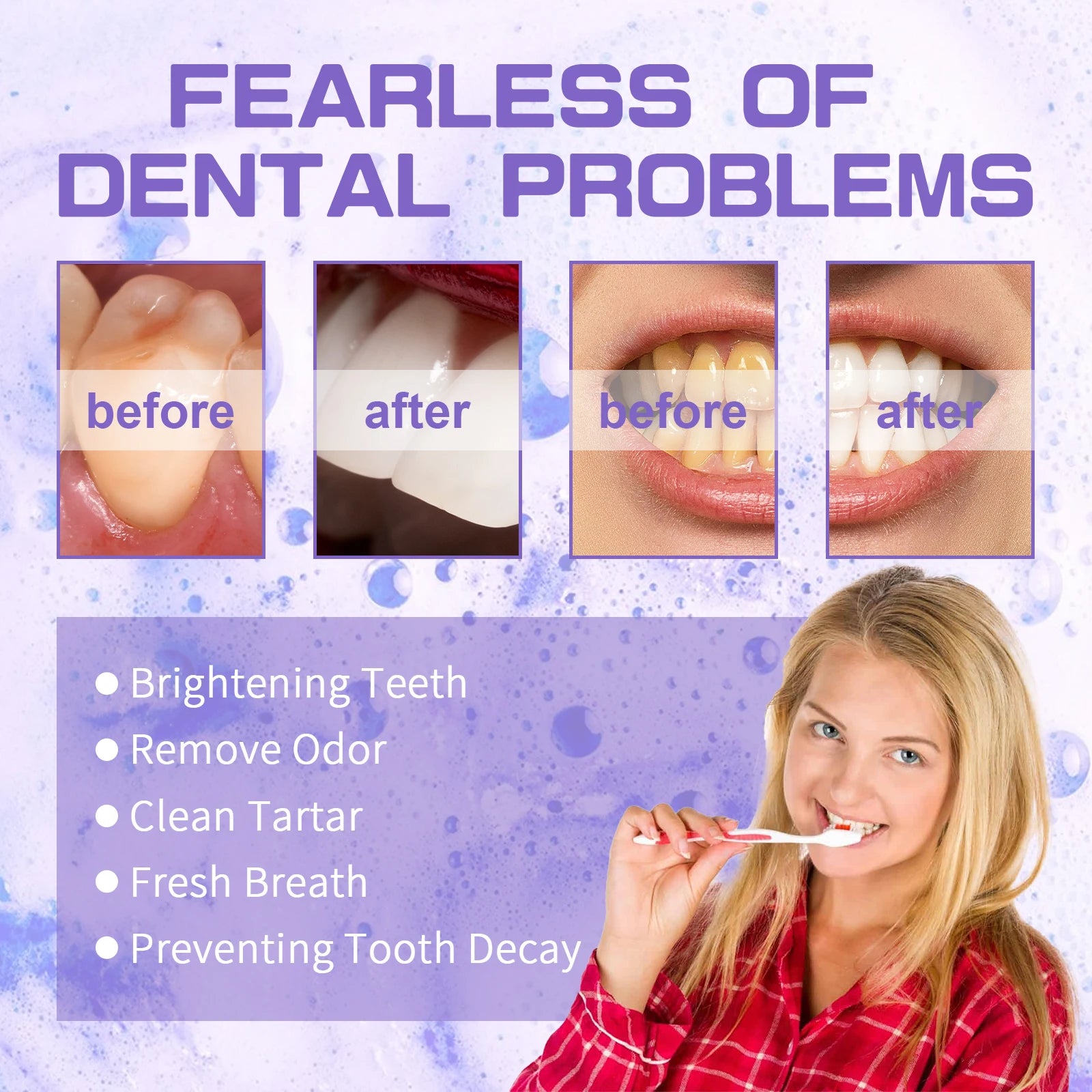 Utilizing the principle of color correction, water-soluble purple ingredients are used to reduce yellow discoloration or stains by offsetting color, restoring teeth to bright whiteness.