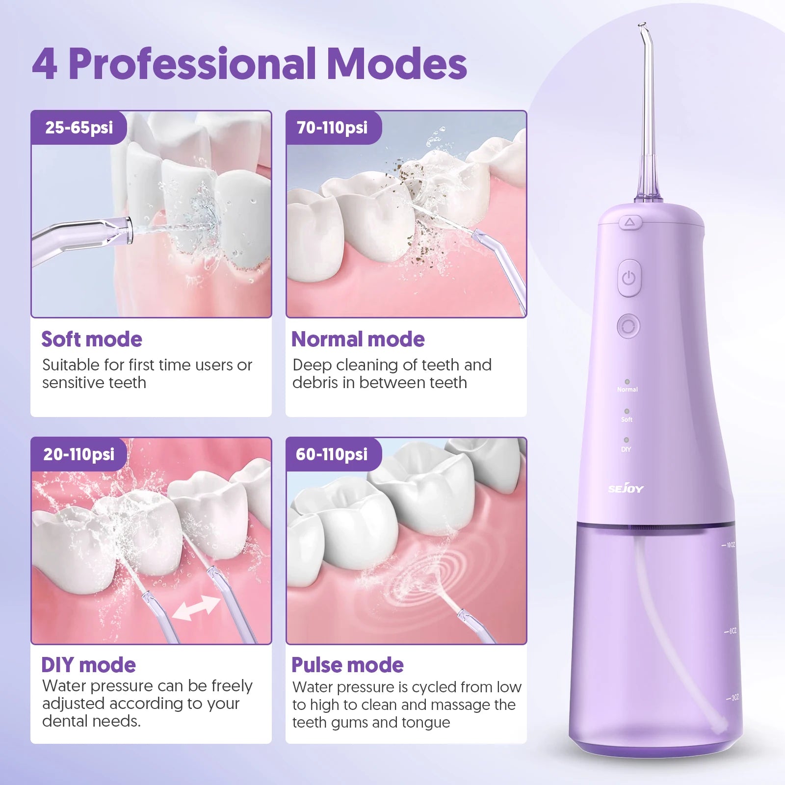 2.【4 Professional Cleaning Modes For Your Choice】: Soft(25-65psi) - for children or first-time user. Normal(70-110psi) - For effective cleaning. Pulse(60-110psi) - Massage Gum, DIY Mode(20-110psi) 20-120PSI speed can be freely adjusted according to your dental needs. Please choose soft mode when you use this electric water flosser for the first time.