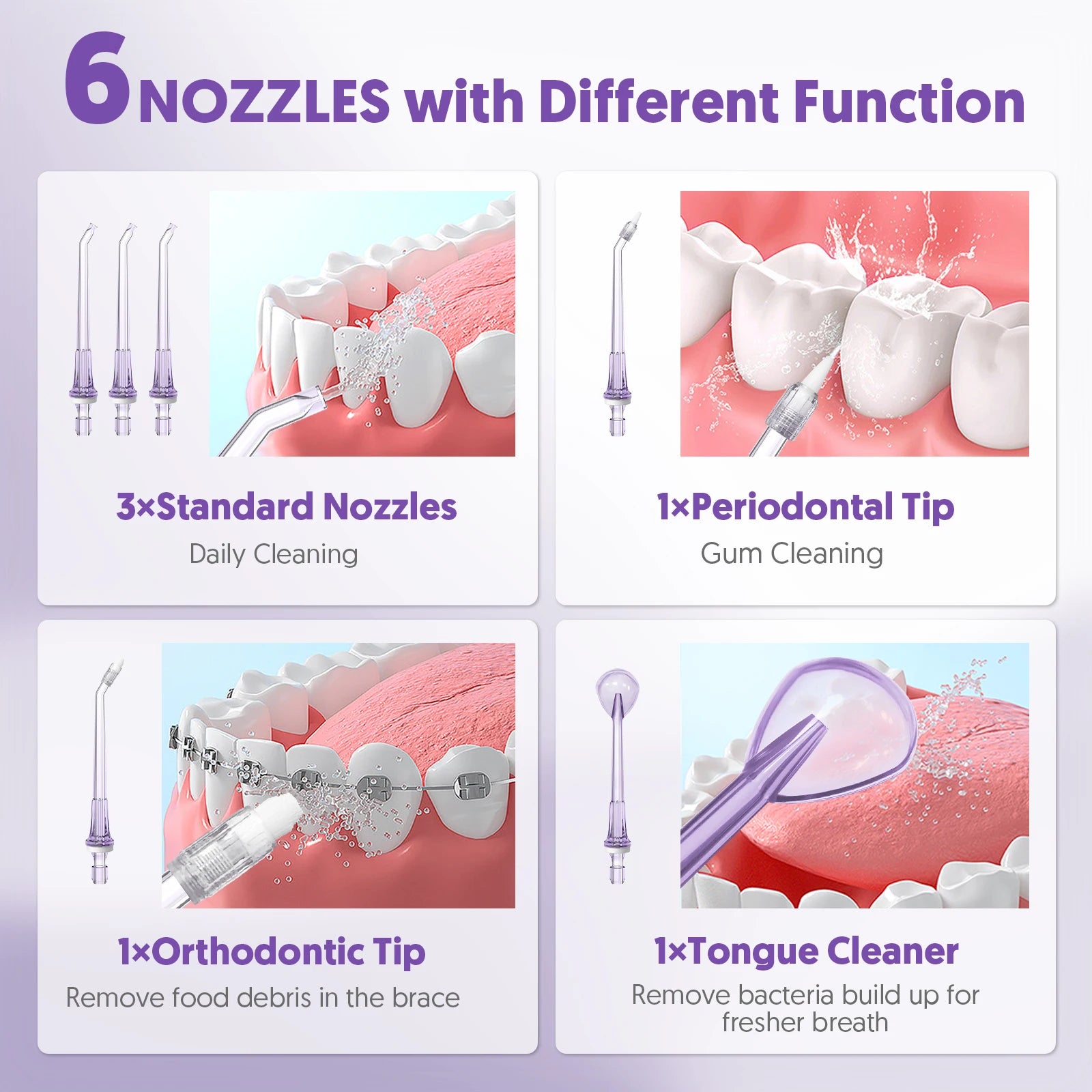 1.【6 Nozzles & 360° Rotation】: This water flosser is equipped with 6 nozzles which can be used with your family. Nozzles with different functions to meet your different needs: standard nozzles, tongue cleaner, periodontal tip and orthodontic tip. 360° rotatable nozzle design allows you to easily clean the interior side that are difficult to reach. (SUGGESTION: To Keep Hygiene, it's recommended to replace the nozzle 3 month).